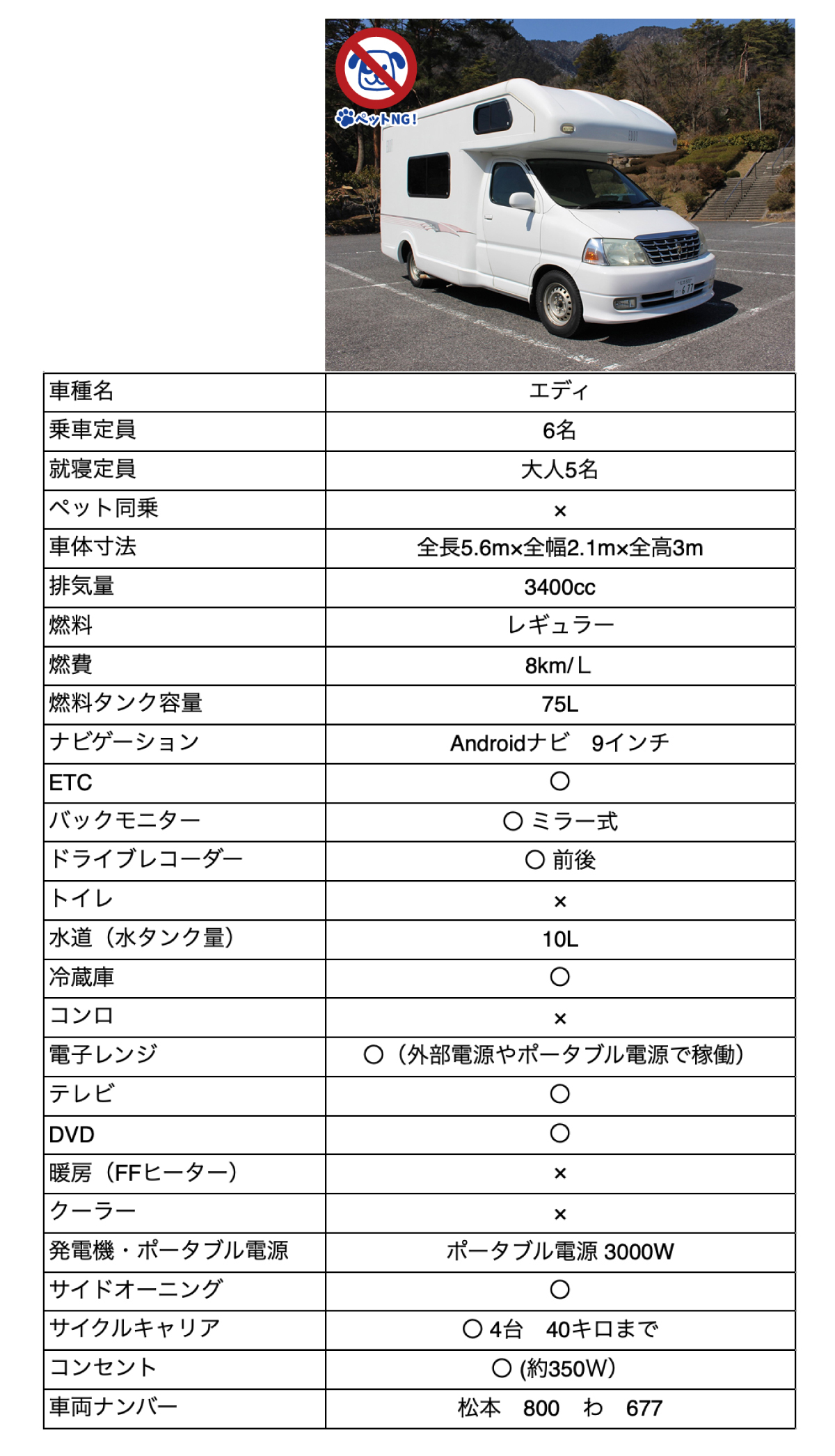 少し大きな車体でゆったり室内です。3400ccガソリンでパワフルな走りです。 定員6名、就寝大人5名 普通免許でO.K.、禁煙、ペット不可